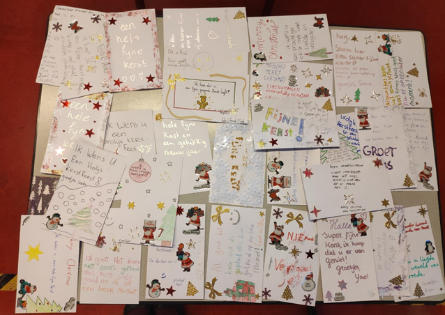 ANBO is een belangenorganisatie voor ouderen en roept op om kerstkaarten te sturen naar deze organisatie, zodat deze kaarten doorgestuurd kunnen worden aan mensen die hier troost en moed uit kunnen putten (zie: https://www.anbo.nl/kerstkaartactie-anbo#). Onze leerlingen hebben stapels kaarten met inhoudelijke kerstgroeten verzorgd. Zo hebben ze niet alleen over christendom geleerd, maar ook over goed burgerschap!
