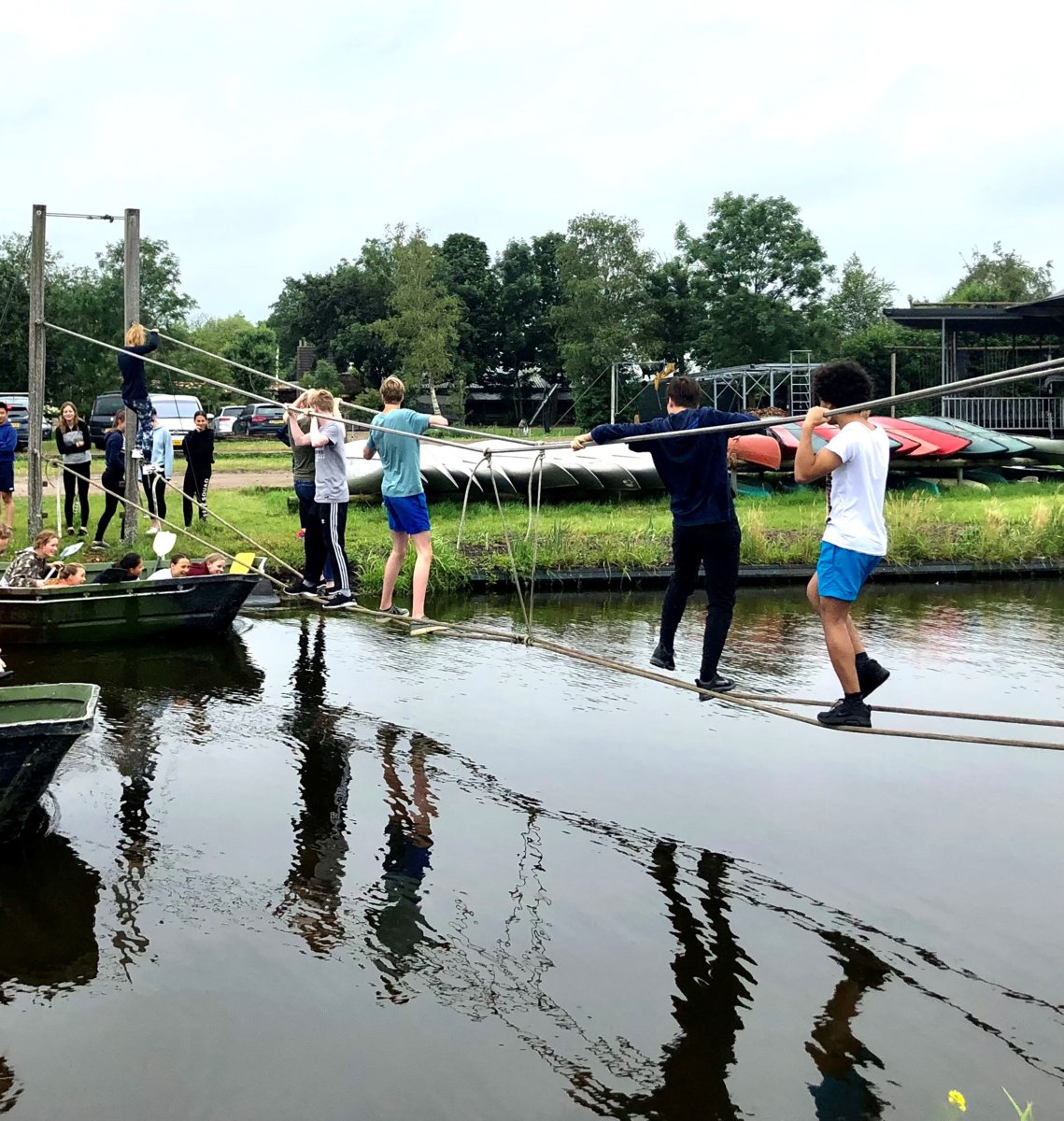 Maar zelfs de grootste kniesoor is een dappere doorzetter, zo blijkt als Simon en ondergetekende een rondje maken. Lachende gezichten en - soms angstige - kreten. Het sympathieke aanbod om deel te nemen aan de oversteek over de touwbrug slaan we beleefd af. We zien een stel bruggers van het Fons Vitae Lyceum in een roeiboot aankomen die onze dappere h3a-ers zonder twijfel een kloeke plons in de boerensloot gaat opleveren... nee, toch niet! Het gaat net goed. Paul, Roemer, Haru en Lex komen droog en wel aan de overkant. Een gemiste kans. Je mag zelf bepalen voor wie.