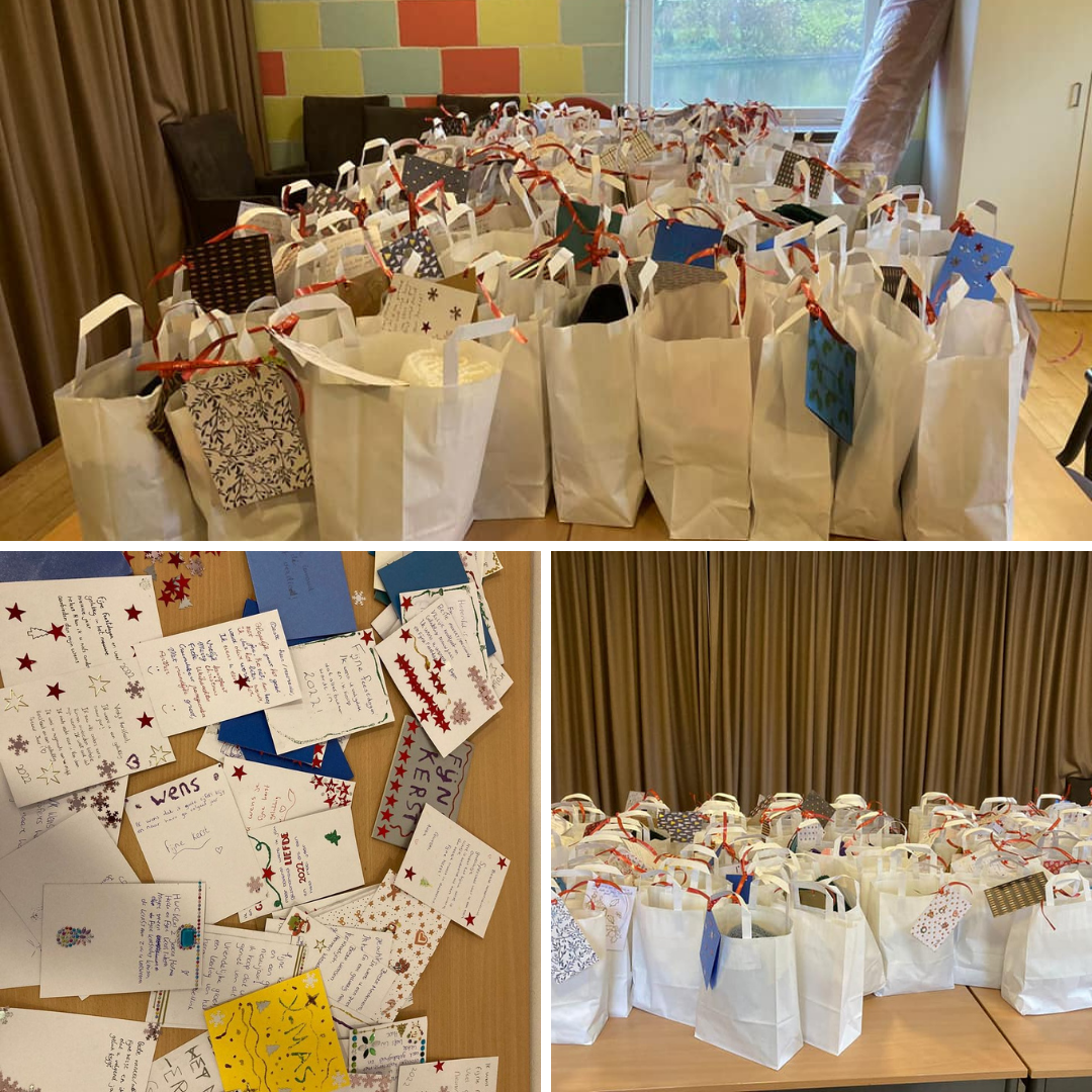 Er zijn 100 kersttasjes gevuld met cadeautjes, ingezameld door mensen van de Kruiskerk Amstelveen, Pauluskerk en Paaskerk 🙂