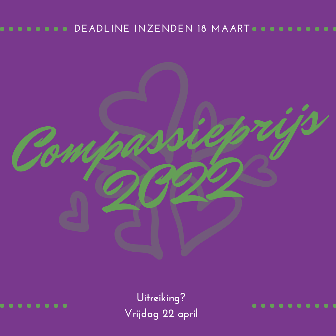 Voor 2022 wilt de Beweging van Barmhartigheid de compassieprijs toekennen aan een scholier, of groep scholieren die in een project of werkstuk een actueel vraagstuk behandelen vanuit het perspectief van compassie. Hierbij stellen zij aan belangstellende scholieren de vraag: wat betekent compassie voor en volgens jou? Hoe komt dat tot uitdrukking in de wereld, op school of in je eigen omgeving? Wat kan helpen om mensen tot meer compassie aan te zetten?