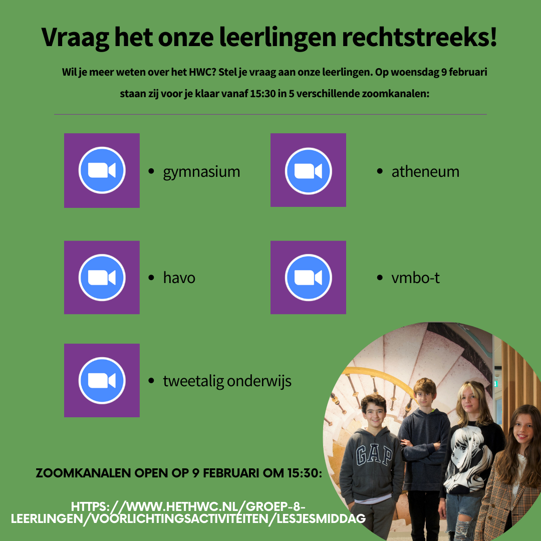Zit je in groep 8, ben je je aan het oriënteren voor het voortgezet onderwijs en wil je meer weten over het HWC? Stel je vraag aan onze leerlingen rechtstreeks. Op woensdag 9 februari staan zij voor je klaar vanaf 15:30 uur in 5 verschillende zoomkanalen.