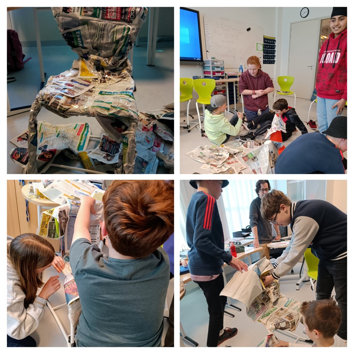 First, we had five minutes to wrap a bottle in newspaper. Then, working in the same groups, we had five more minutes to wrap a chair using newspaper. For this task, we had reduced resources and were not allowed to speak to each other. Finally, we had five more minutes to wrap a PE cone. This time we had ample material, were allowed to talk, but were not allowed to use our hands. While doing so, we were given an additional object to wrap, with no extra time to complete the task.