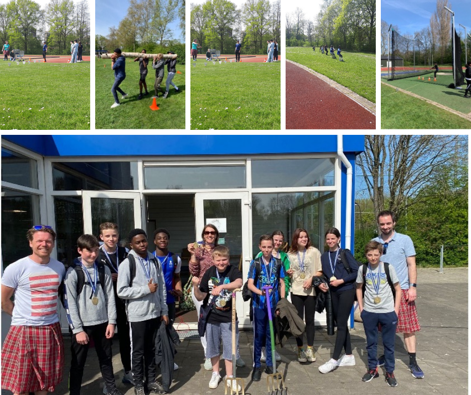 Eerst was er een lunch en een rondleiding door de school, in gemengde groepen leerlingen van beide scholen. Daarna gingen we richting de atletiekbaan. Daar aangekomen trokken de begeleidende docenten tot grote hilariteit van de leerlingen een echte schotse rok aan en gingen de Highland games van start. Onderdelen als ‘hammer throw’, ‘caber wave’, ‘sheaf toss’ en ‘tug of war’ werden met groot enthousiasme uitgevoerd.
