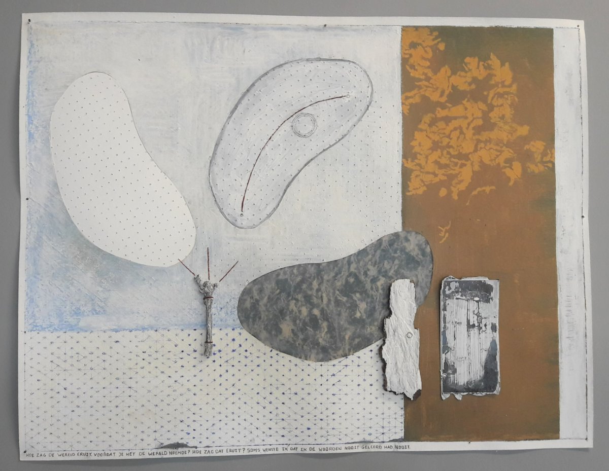 Ik was erg getroffen door het poëtische karakter van het werk, niet in de laatste plaats door de zin die eronder staat: ‘Hoe zag de wereld eruit voor je het de wereld noemde? Hoe zag dat eruit? Soms wenste ik dat ik de woorden nooit had geleerd. Nooit’. Uit deze zin blijkt voor mij de open blik en houding naar zaken die voor ons soms vanzelfsprekend zijn. Ook is er een prachtige harmonie in het beeld tussen de verschillende onderdelen. Let verder op de uiterst verfijnde manier van bewerking van het oppervlak. Er is niet alleen geschilderd, maar ook met pen getekend en zelfs geborduurd. Kortom, een heerlijk werk. Beschouwing van dichtbij loont de moeite!