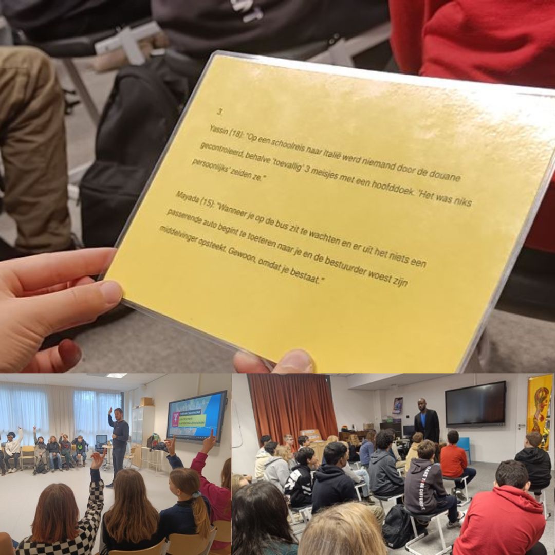 Op 14, 15 en 18 november hebben we een themadag georganiseerd voor al onze brugklassen over racisme, discriminatie, pesten en diversiteit. Op interactieve en creatieve wijze maakten de leerlingen kennis met waargebeurde verhalen tijdens de programmareeks ‘De Verhalen’. De leerlingen hebben eerst gekeken naar de voorstelling ‘Racisme’ en gingen vervolgens in gesprek met de acteur en met elkaar. De Verhalen - Racisme is een thema dat al eeuwen speelt, maar heeft sinds de afgelopen jaren aandacht gekregen door de Black Lives Matter-beweging. Voor veel leerlingen is racisme een thema dat ver van hen af ligt. Vaak denken ze “Hier valt het toch wel mee?” of “Ik doe toch niets verkeerd?”. Begrijpelijke gedachten, want zolang je de verhalen niet direct kent, is het natuurlijk lastig om je gedrag, waar nodig, aan te passen. De verhalenverteller heeft daarom tijdens dit programma waargebeurde verhalen van hemzelf en anderen verteld. De leerlingen hebben zich kunnen verplaatsen in alledaagse situaties van mensen die, ook hier, met racisme te maken hebben.