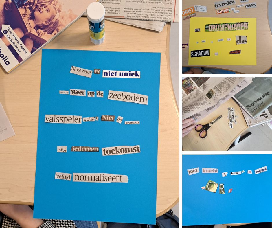 Een aantal klassen havo 3 is tijdens de lessen Nederlands creatief aan de slag gegaan met letters en woorden uit kranten en tijdschriften. Onder leiding van kunstenares Marloes Beets kregen de leerlingen de opdracht woorden uit te knippen die hen aanspraken om deze vervolgens om te toveren tot een nieuw verhaal, gedicht of spreuk. Het leverde een groot aantal pareltjes op!