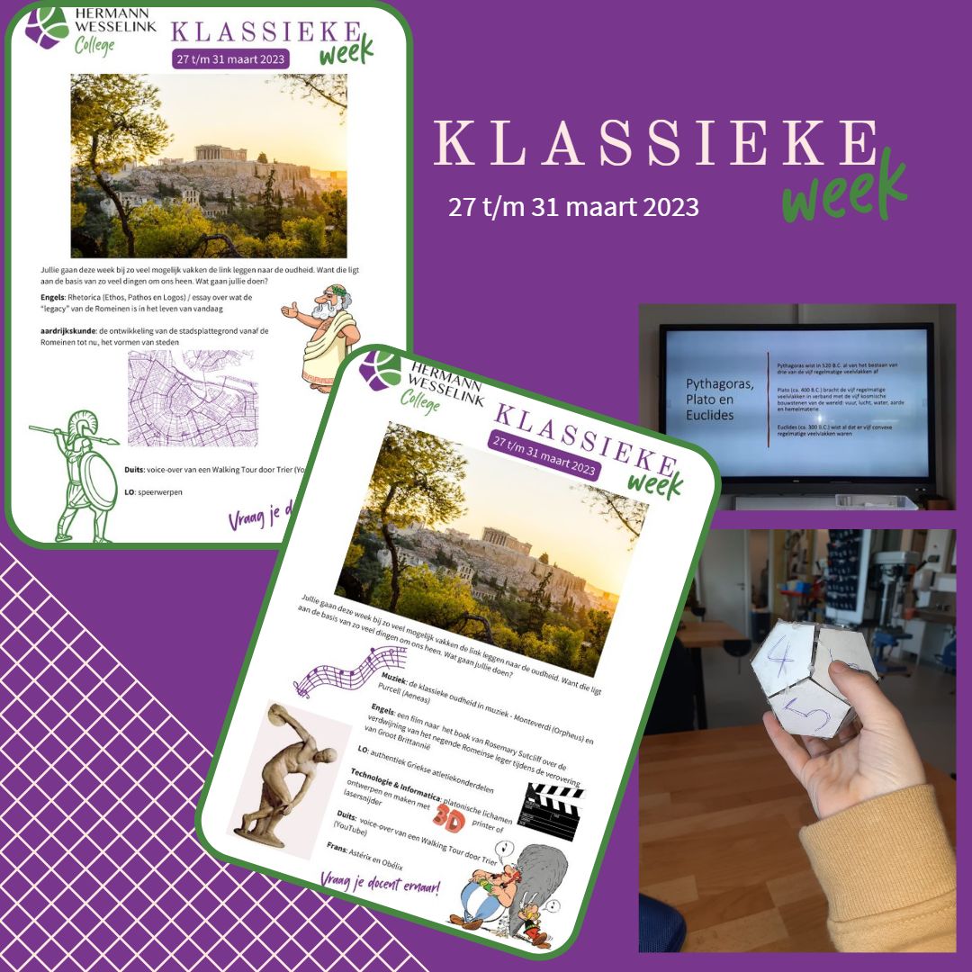 Van 27 t/m 31 maart stonden de lessen van onze gymnasiumleerlingen (klas 1 en 2) in het teken van de Klassieke Week. Bij de verschillende vakken werd de link gelegd naar de oudheid. Want die ligt immers aan de basis van zo veel dingen! Een greep uit de lessen: Griekse atletiekonderdelen bij LO, platonische lichamen ontwerpen bij T&I, Astérix en Obélix bij Frans, de ontwikkeling van de stadsplattegrond en het vormen van steden bij AK. Een hele diverse en geslaagde week!
