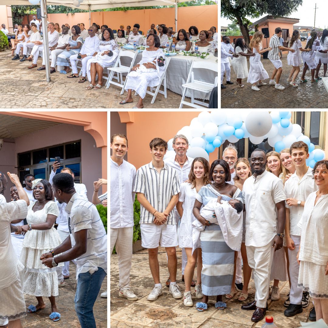 Dat betekent hallo en welkom. Hij ging verder met het zegenen van de naam Hendrik. Ineens begon iedereen met zingen in het Ghanees. We verstonden helaas niks van de tekst, maar anders hadden we zeker meegezongen. Na de ceremonie kon het feest echt beginnen. Er stond een heel buffet voor ons klaar en iedereen was aan het genieten van het eten. De muziek stond aan en er hing een goede sfeer. Na het eten begonnen we te dansen en steeds meer mensen deden mee. Uiteindelijk stonden we met 30 man in de regen te dansen. Zelfs de vader van Fred heeft zijn dansmoves nog even laten zien.