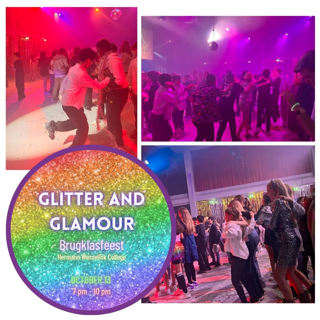 Op vrijdag 13 oktober werd een spetterend feest georganiseerd voor alle brugklas- en ICC-leerlingen op het HWC. De theaterzaal was omgetoverd tot een schitterende feestlocatie, passend bij het thema van de avond: "glitter and glamour".