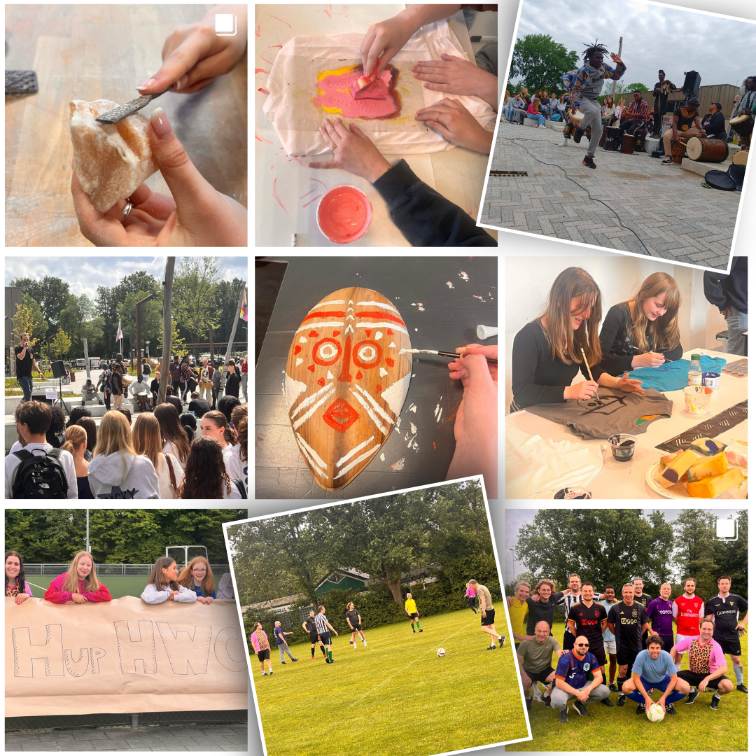 30 mei was een dag vol workshops in het teken van Afrika, ter ere van het 60-jarig bestaan van het HWC! De leerlingen hadden zich voor verschillende muzikale en artistieke workshops ingeschreven. Zo konden ze deelnemen aan djembé, darbuka, waterdrums, trash-percussie en samba percussie. Ook werden er dansworkshops zoals Afro House, Afro Fusion, Afrodance en Capoeira aangeboden. Voor creatievelingen waren er sessies zoals mokken beschilderen, oorbellen maken met Afrikaanse stoffen en kleding pimpen. Daarnaast konden de leerlingen leren over het bereiden van insectenhapjes en het maken van henna kunst en Tembe schilderingen uit Suriname. Een onvergetelijke dag vol muziek, dans en kunst!