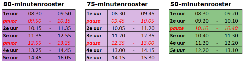 Op maandag, woensdag, donderdag en vrijdag geldt een 80-minutenrooster. Op dinsdag is er - in verband met vergaderingen in de middag - een aangepast rooster; alle lessen en pauzes zijn dan 5 minuten korter. Af en toe zijn er, in verband met bijvoorbeeld een studiedag, 50-minutenlessen.