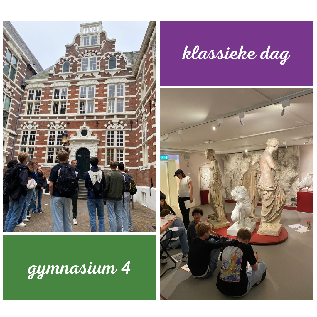 Deze week gingen de leerlingen van de 4e klas gymnasium op excursie naar Amsterdam voor een 'klassieke dag'. Ze bezochten de gipsen zolder van het Allard Pierson museum voor een teken workshop en kregen een rondleiding in de stad van een archeoloog die ze gebouwen liet zien beïnvloed door de Griekse architectuur. De leerlingen kennen nu het verschil tussen de Hollandse renaissance, het Classicisme en Neoclassicisme!