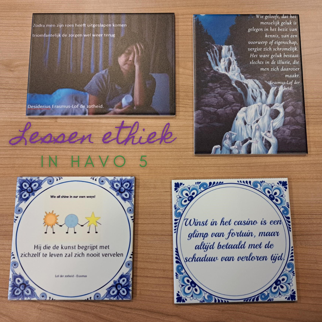 Bij de lessen ethiek leren de leerlingen van havo 5 over onze Erasmus, een humanist van eigen bodem. Erasmus heeft veel gereisd en nog meer nagedacht. In zijn boek Lof der Zotheid uit hij zijn kritische filosofieën in de vorm van wijsheden. Onze leermethode laat de leerlingen met deze spreuken kennismaken en we vragen van ze om een tegeltje te ontwerpen met de spreuk van hun keuze. Dit moeten ze vervolgens beargumenteren. Sommige leerlingen herkennen iets waars, want de tegel over het casino raakte een snaar bij een leerling die gegokt heeft en heeft verloren. Andere leerlingen stellen zich kwetsbaar op als ze een spreuk in verband brengen met iets wat ze hebben meegemaakt. De winnaar krijgt een prijs: een echt tegeltje.
