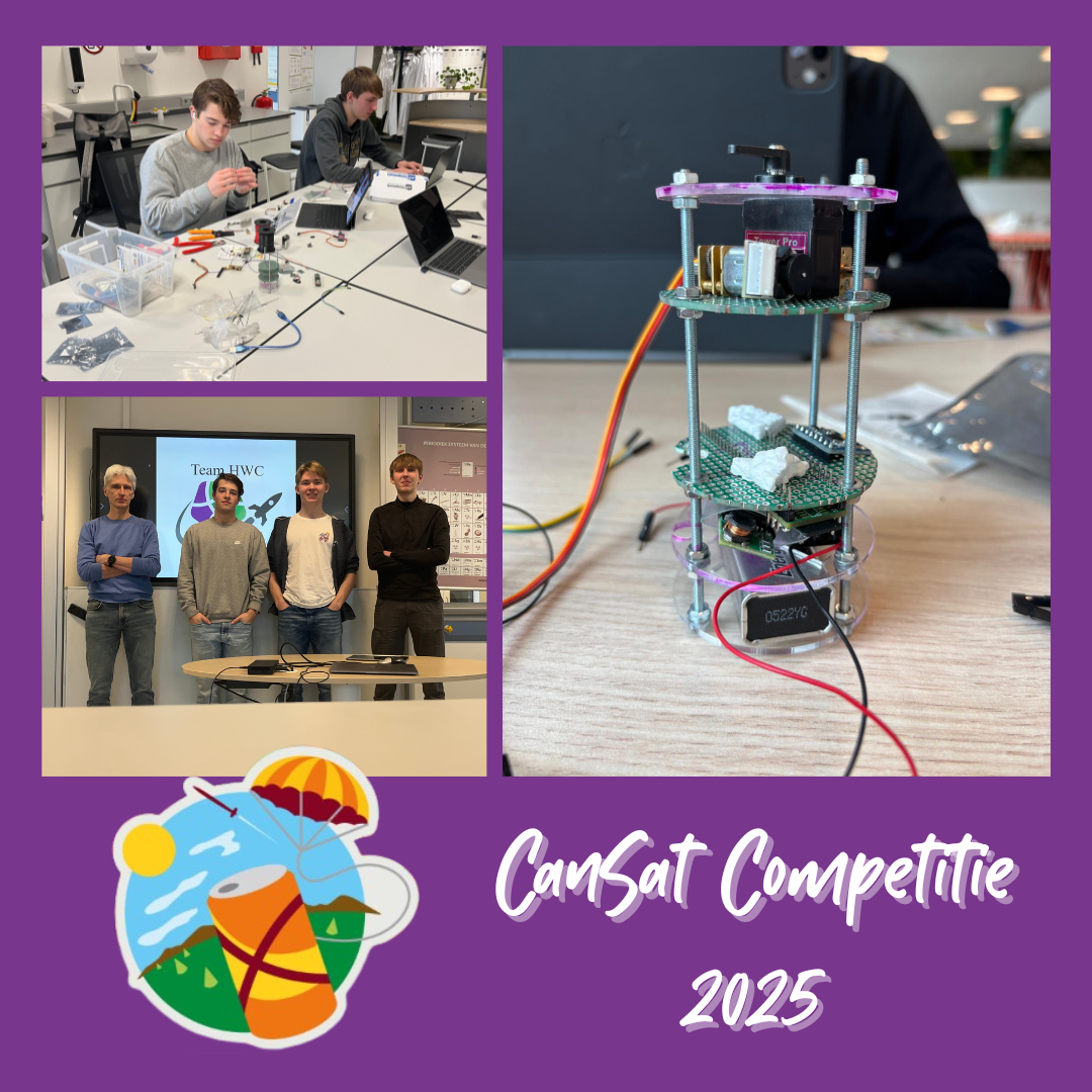 Wij zijn Tim Reijnen, Tije Woudenberg en Nikolay Ryabov, leerlingen uit vwo 5, en samen vormen wij Team HWC. Wij doen mee aan een bijzondere competitie genaamd CanSat, waarbij teams hun eigen satelliet ontwerpen, bouwen en testen in het formaat van een frisdrankblikje. Onze doelen voor dit project zijn (primair) het meten van luchtdruk, temperatuur en snelheid tijdens de vlucht, en deze data terugsturen naar onze ontvanger. En (secundair) het ontwikkelen van een systeem waarmee onze satelliet, met behulp van een parapente en GPS, gecontroleerd kan landen op een vooraf gekozen locatie.