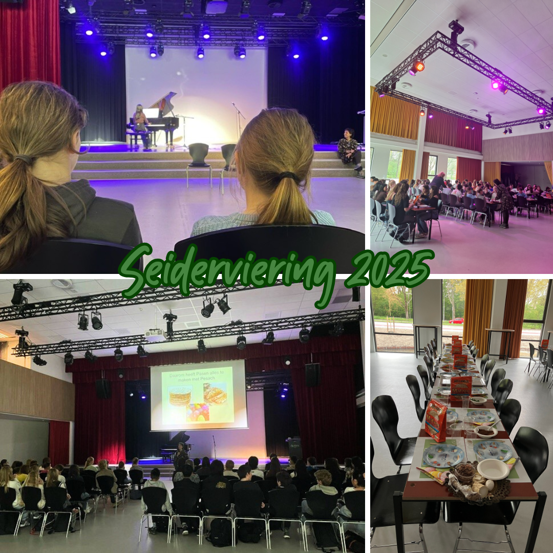 Dit jaar namen zo'n zeventig leerlingen uit voornamelijk de eerste klassen deel aan deze viering. De betekenis van deze viering werd toegelicht door één van die leerlingen en andere leerlingen maakten muziek. Daarna konden we met z'n allen aan tafel om matses en paasbrood te eten.