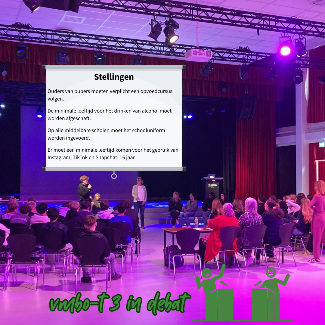 Op donderdag 22 mei gingen de leerlingen van vmbo-t 3 met elkaar in debat over een aantal prikkelende stellingen. Onder leiding docent mevrouw Harleman debatteerden zij over onderwerpen als social media, alcoholgebruik, schooluniformen en opvoedcursussen voor ouders.